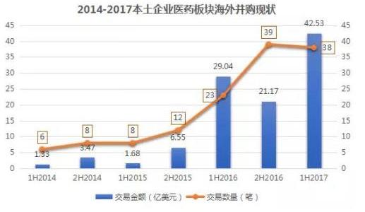 自2014年以来,本土企业在医药领域的海外投资交易增势迅猛,交易数量和交易金额实现突破性增长,交易金额同期比的平均增速高达400%,于本年度上半年已达42.53亿美元(约289.5亿元人民币)。