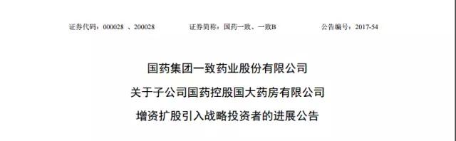 2016年9月,国大药房被国药一致收购,成为国药集团战略性零售平台,国药一致将致力于医药分销及零售业务,不再控股医药工业相关资产。