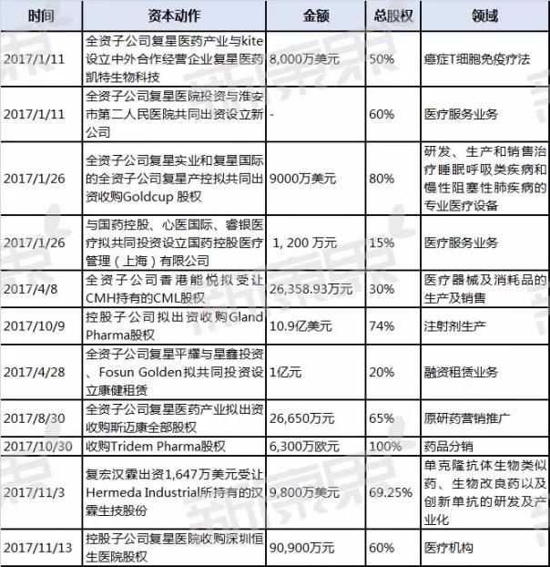 2017年的复星医药资本动作频频,长期霸占医药圈新闻的头条版面,成为医药圈小伙伴们重复提起的热词之一。今年复星医药共有11项投资,其中主要分两条线来布局,一是医疗领域,购买医院股权,设立医疗机构管理中心,这位医药界的大佬试图进入医疗圈的态度非常明显。二是研发线,复星医药2017年在肿瘤、慢阻肺等热门领域接连布局。其中,值得注意的是,国庆长假期间,复星医药收购Gland Pharma落下帷幕,以10.91亿美元(折合72.58亿人民币)正式完成收购,该公司是印度第一家获得美国FDA批准的注射剂药品生产制造企业。