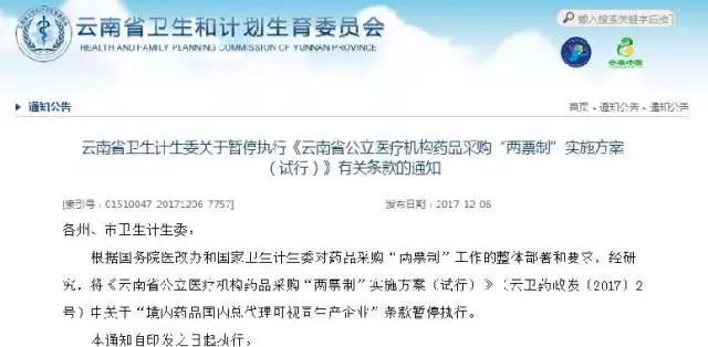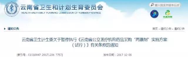 12月6日,云南卫计委发布《关于暂停执行<云南省公立医疗机构药品采购“两票制”实施方案(实行)>有关条款的通知》。