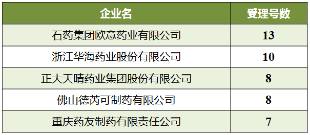 表1 2017年化学药新4类/旧6类申报受理号数前五企业