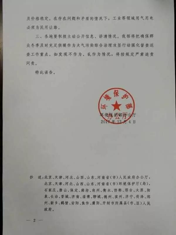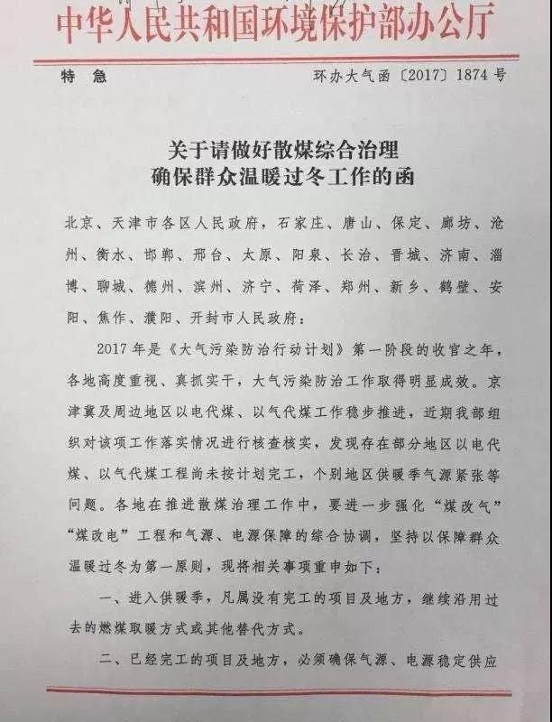 据中国经济网报道,环保部已于12月4日向京津冀及周边地区“2+26”城市下发《关于请做好散煤综合治理确保群众温暖过冬工作的函》特急文件,提出坚持以保障群众温暖过冬为第一原则,“进入供暖季,凡属没有完工的项目或地方,继续沿用过去的燃煤取暖方式或其他替代方式”。