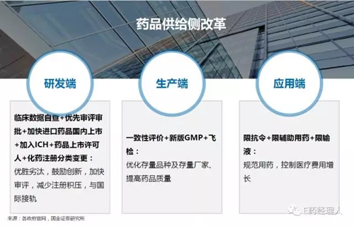 从生产端来看,最重要的政策就是仿制药一致性评价,通过一系列配套组合拳,要做到优化存量品种及存量厂家、提高药品质量。