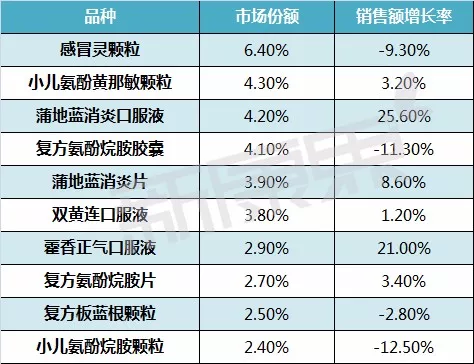 2016年感冒药零售市场TOP10品种