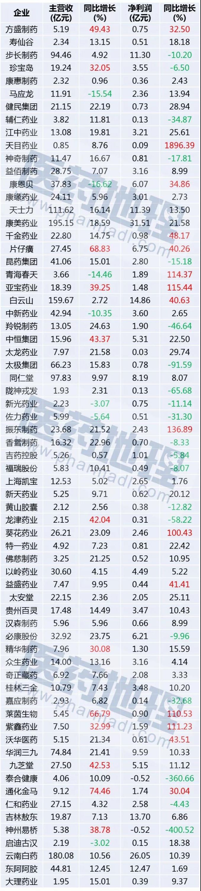附:67家中药上市企业业绩增长情况