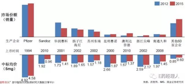 例如,2007年,氨氯地平仿制药在美国上市,至2014年原研药“络活喜”的市场份额仅剩0.5%;在我国,由于加入WTO之前我国药品专利缺位,中国2000年就有氨氯地平仿制药上市,但络活喜目前仍占据超过40%的市场份额。仿制药第二梯队如华润赛科、扬子江海尼无论在市场份额还是价格上均不足原研的一半。还有超过60家企业价格体系崩溃,中标价格不足1元,每家企业占据极小的市场份额。