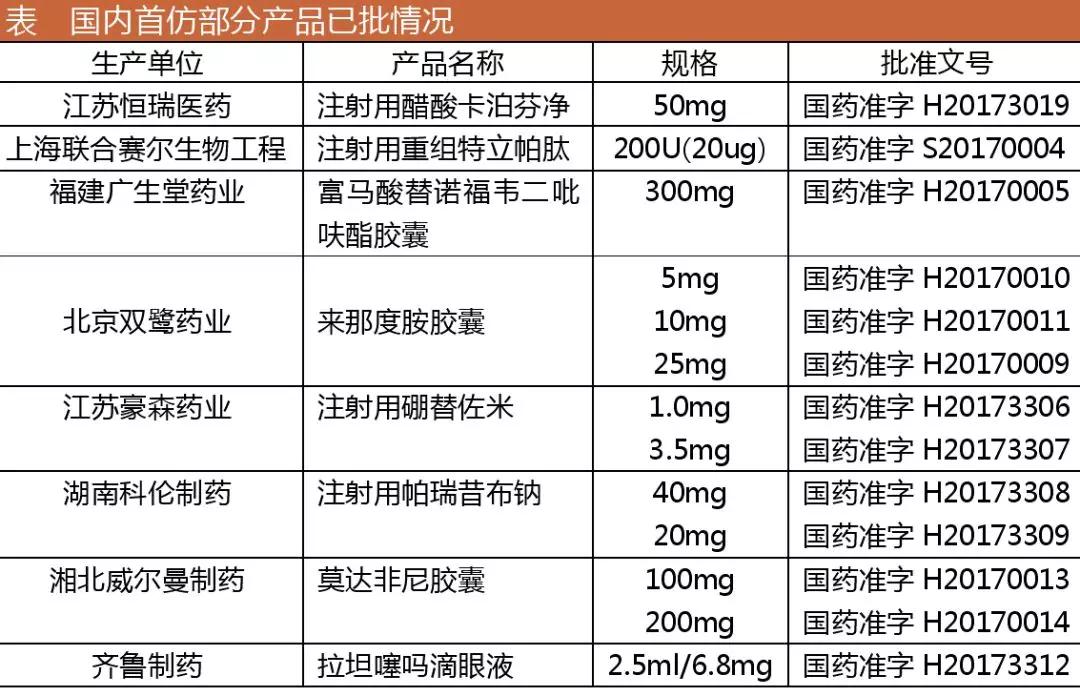 2017年已批上市的首仿产品主要有:恒瑞的注射用醋酸卡泊芬净、广生堂富马酸替诺福韦二吡呋酯胶囊、双鹭的来那度胺胶囊、豪森的注射用硼替佐米、科伦的注射用帕瑞昔布钠、湘北威尔曼制药的莫达非尼胶囊、齐鲁制药拉坦噻吗滴眼液、上海联合赛尔的注射用重组特立帕肽等。首仿产品技术先进,可以培育新的市场,利润较为可观,产品创新难度相对较低,可为企业带来不错的业绩,未来在高端产品领域实现进口替代的局面将不断加剧。