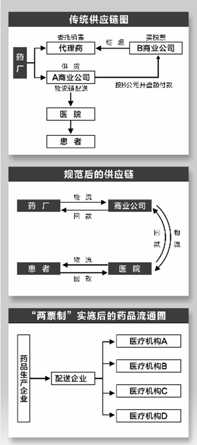 从这些大企业的角度来说,两票制的推行确认无疑。但是,在由谁选择配送商的问题上还有争议。商业公司认为,有些地方由医院来选配送商是不合理的,应该由生产企业来选择配送商,或者说政府列出配送企业清单,生产企业可以从配送企业清单库里选择。