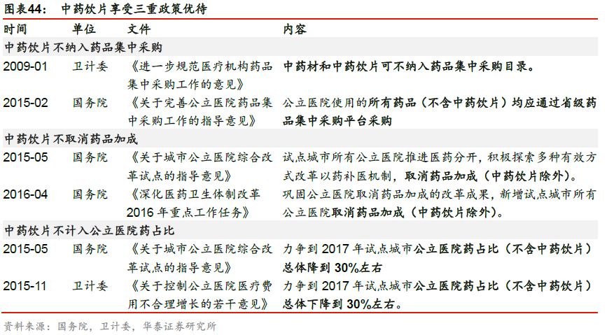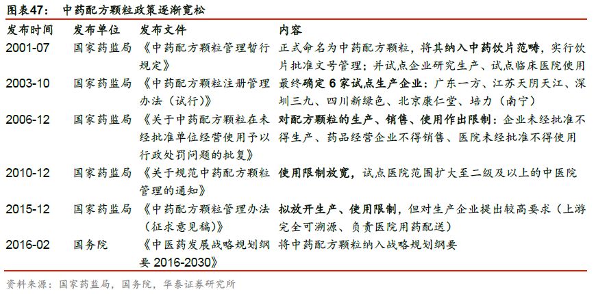 从生产端来看,2015 年底,国家药监总局发布《中药配方颗粒管理办法(征求意见稿)》中表示,拟全面放开配方颗粒的生产、使用限制,但对企业提出较高要求(上游完全可溯源、负责医院用药配送)。