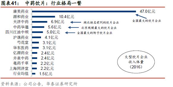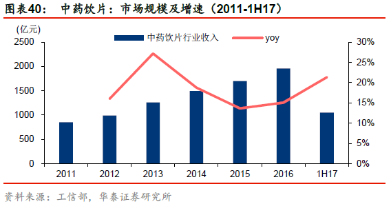 得益于纳入 2009 版基药目录,中药饮片发展迅速。根据工信部数据,2011-2016 年市场规模复合增速达 18%,2016 年行业规模逼近 2000 亿元。而由于行业准入壁垒低,行业格局呈现小、散、乱,龙头公司 2016 年市占率不足 5%。