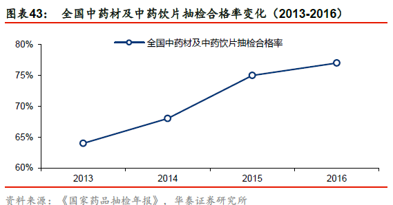 监管缺失导致饮片行业以低标准运行,药材质量饱受医师诟病。2014 年新版 GMP 颁布,企业为满足新规投入千万级技术改造费用,小产能淘汰,市场初步整理,抽检合格率从 2013 年的 64%上升至 2016 年的 77%,行业格局得以改善。
