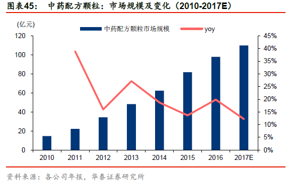 我国中药配方颗粒行业发展迅速,市场规模从 2010 年的 15 亿元增长到 2015 年的 82 亿元(CAGR 达 40%)。