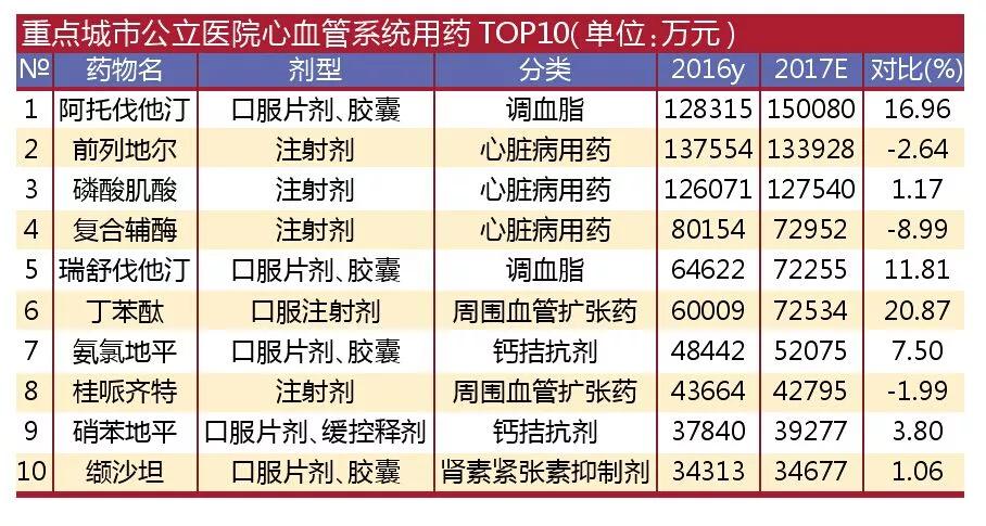 心血管用药TOP10中,心脏病用药有前列地尔、磷酸肌酸和复合辅酶,这些品种在医院控药政策之下增长乏力。