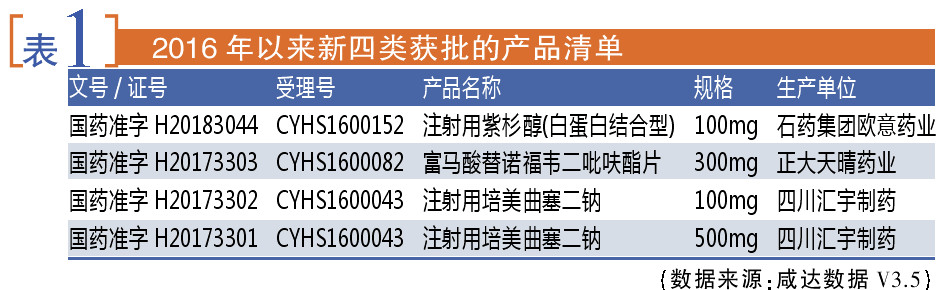 四川汇宇制药的注射用培美曲塞二钠2016年以新4类申报,并且以“已在欧盟递交注册申请,获得英国MHRA、GMP认证”为由获得优先审评,最终在同年获批。苏州特瑞药业的同名竞品2015年以旧6类申报,排队直到2017年8月才获得资料发补的通知。