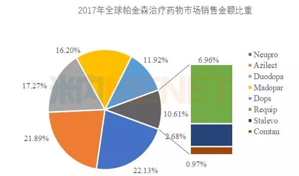 据2017年美国IMS数据,在全球500强畅销药物市场中,抗帕金森治疗市场为20.56亿美元,同比上一年增长了3.73%。TOP5的品种中,罗替戈汀(Neupro)占据22.13%,雷沙吉兰(Azilect)占据21.89%,左旋卡比多巴(Duodopa)占据17.27%,多巴丝肼(Madopar)占据16.20%,屈昔多巴(Dops)占据11.92%,其它3个品种占据10.59%的份额。