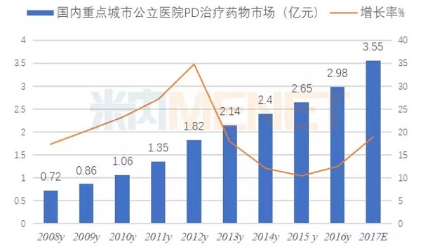 数据显示,2013~2015年我国PD用药总体市场规模分别为16.94亿元、18.44亿元和19.12亿元,2016年已超过了20.10亿元的市场规模。