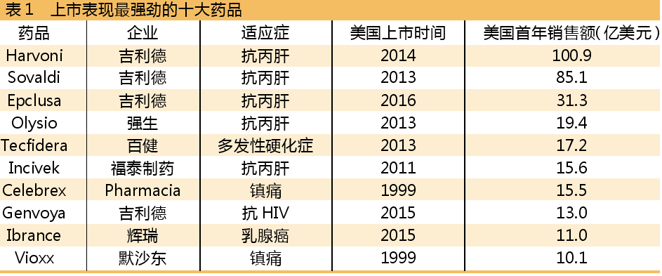 根据对新药在美国市场头4个季度的销售数据分析,排名前四的药物均为丙肝药,其中,位列榜首的是吉利德(Gilead Sciences)抗丙肝药物Harvoni,其在美国市场首年销售额达到101亿美元。该分析没有列入仿制药和疫苗,因为这些药物的销售模式和刚上市的急性病或慢性病药物的销售模式存在很大不同。