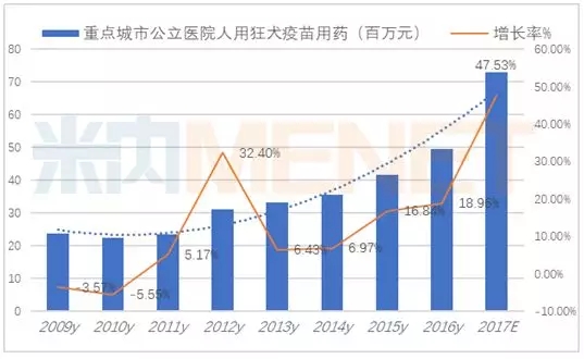 据米内网数据显示,2017年重点城市公立医院人用狂犬疫苗达到了7295万元的市场规模,同比上一年增长45%以上,TOP3厂商是辽宁成大生物、广州诺诚生物和成都康华。狂犬病疫苗利润较高,市场竞争较为激烈。