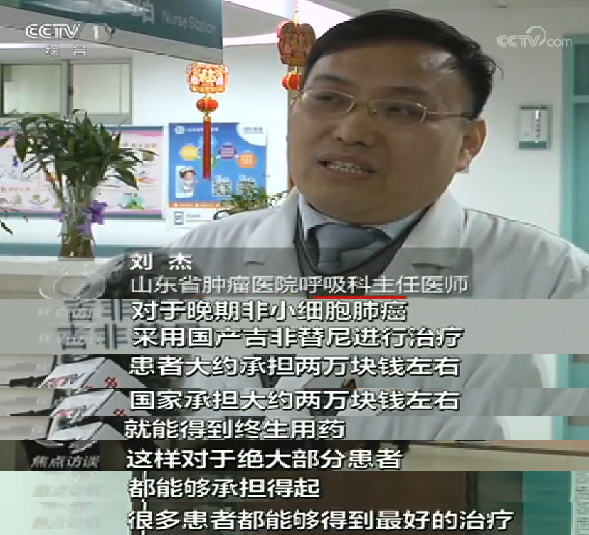 山东肿瘤医院的一位主任医师算了个账“采用国产吉非替尼进行治疗,国家大约承担两万块钱左右,患者大约承担两万块钱左右,此后就能得到终生用药。这对于绝大部分患者,都能负担的起,都能得到最好的治疗”。