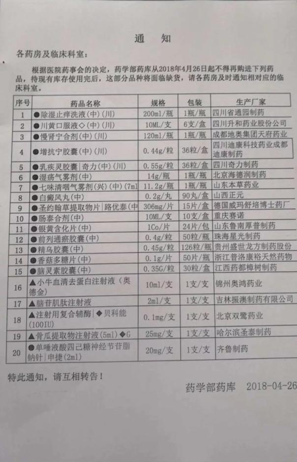 近日,医药朋友圈流出了这样一则消息:西南某医院药学部药库发布通知,自2018年4月26起,该院将对除湿止痒洗液、川黄口服液、慢肾宁合剂等20种药品不再购进,另外,对替波定、力扑素、波立维等13种药品进行限量采购。