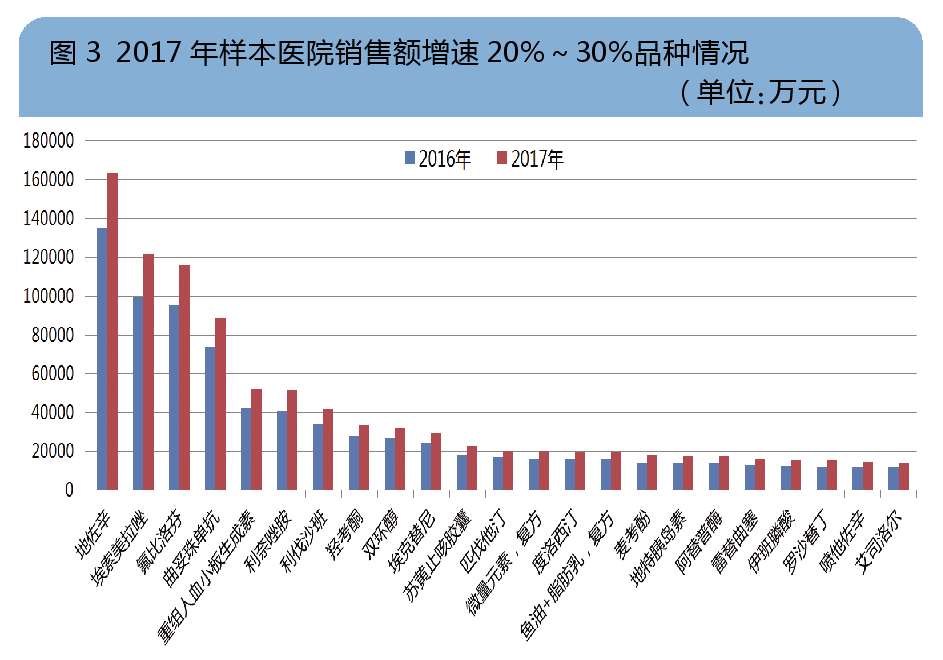 2017年,国内样本医院增速20%~30%品种中用药金额5亿~10亿元的有3个,分别是:曲妥珠单抗用药金额8.8亿元,增速20.4%;重组人血小板生成素用药金额5.2亿元,增速23.7%;利奈唑胺用药金额5.2亿元,增速27.3%。