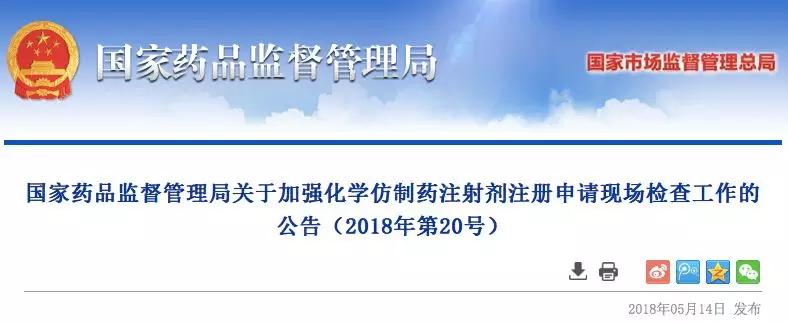 5月14日,国家药监局发布《关于加强化学仿制药注射剂注册申请现场检查工作的公告(2018年第20号)》。