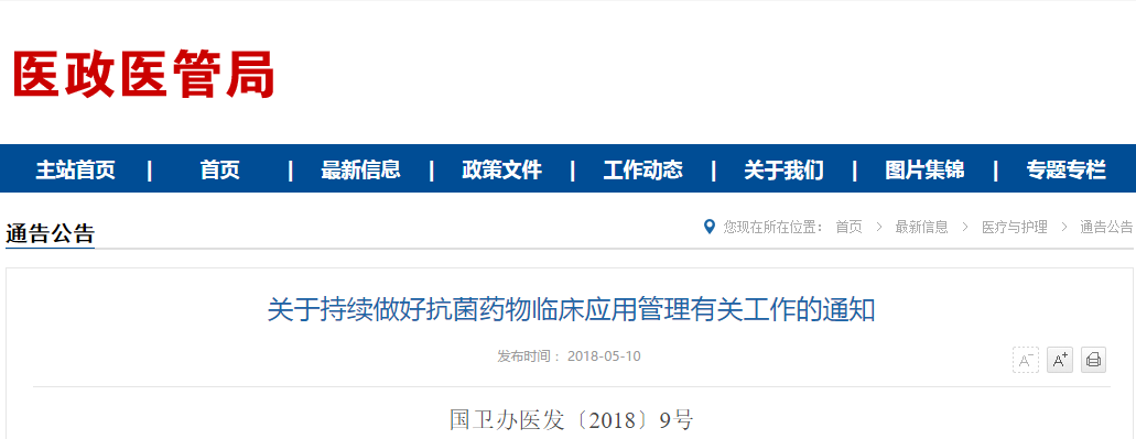 近日,卫健委医政医管局发布《关于持续做好抗菌药物临床应用管理有关工作的通知》国卫办医发〔2018〕9号,要求进一步加强抗菌药物临床应用管理。