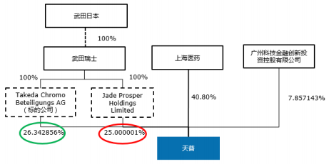 此外,Sunrise Bright Investment Limited(简称:Sunrise Bright)出资1.36亿美元(折合人民币约8.66亿元)收购武田瑞士全资子公司Jade Prosper Holdings Limited的100%股权,从而间接持有天普25%的股份。