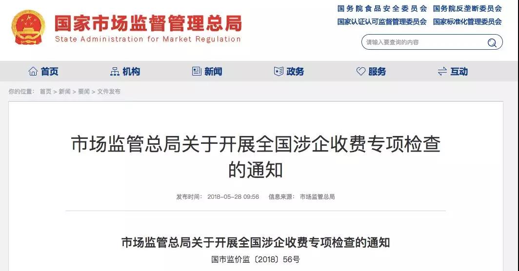医药网5月29日讯 对于降低实体经济成本,国家接连释放利好消息。5月28日,国家市场监管总局印发《关于开展全国涉企收费专项检查的通知》( 国市监价监〔2018〕56号,以下简称《通知》),部署各地于今年5月至11月开展涉企收费专项检查工作,依法查处各类涉企违规收费行为。