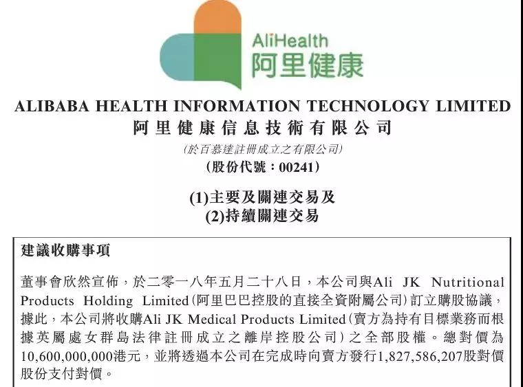 5月29日,阿里健康发布公告,通过发行股份方式收购阿里巴巴子公司Ali JK Medical Products Limited,总代价相当于106亿港元。