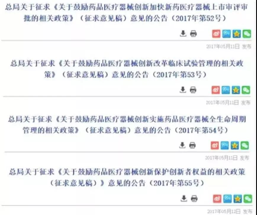 2017年5月开始,当时的国家食药监总局密集发布《总局关于征求<关于鼓励药品医疗器械创新加快新药医疗器械上市审评审批的相关政策>(征求意见稿)意见的公告(2017年第52号)》等系列文件,目的“进一步深化审评审批制度改革,促进药品医疗器械产业结构调整和技术创新,提高产业竞争力,满足公众临床需要”。