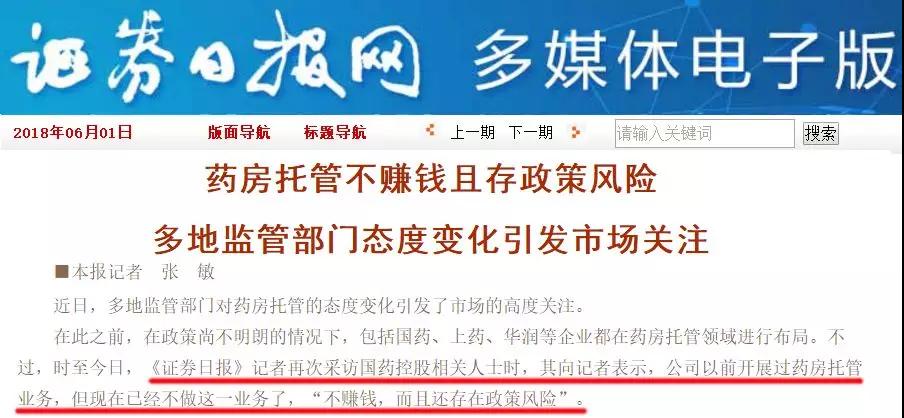 日前,据《证券日报》报道,国药控股的相关人士表示,公司以前开展过药房托管业务,但现在“不赚钱,而且还存在政策风险”,已经不做了。