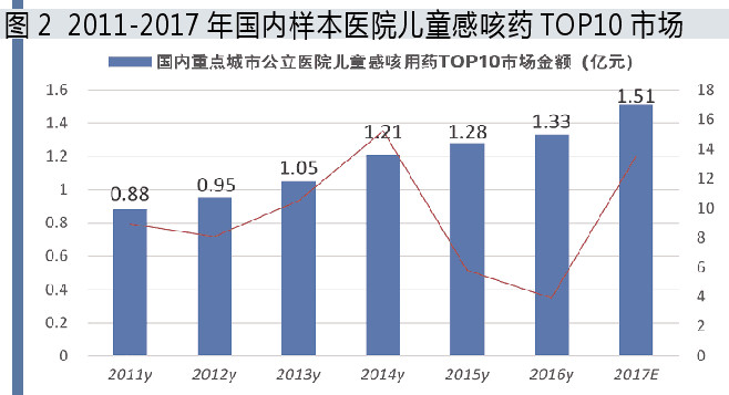 据米内网数据,2017年进入国内重点城市公立医院小儿感冒咳嗽用药的主要品种有26个,用药金额近3亿元。TOP10药物是:氨溴特罗口服溶液、小儿氨酚黄那敏颗粒、氨酚麻美小儿干混悬剂、愈酚甲麻那敏颗粒、美敏伪麻口服溶液、伪麻美芬小儿滴剂、氨咖黄敏溶液、氨酚麻美干混悬剂、酚麻美敏口服溶液、复方福尔可定溶液。TOP10用药金额为1.51亿元,同比上一年增长13.62%。估算国内公立医疗机构及药店零售市场小儿感冒灵咳嗽用药达到50亿元规模。