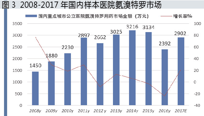 据米内网数据,2017年国内重点城市公立医院氨溴特罗用药金额达2902万元,同比上一年增长21.33%,表现出平稳增长的态势。