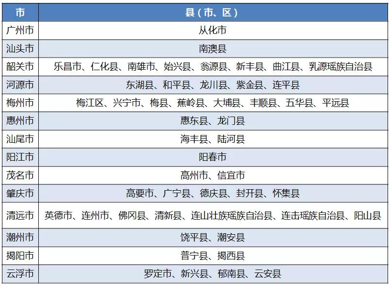 表1 《广东省公立医疗机构药品交易“两票制”实施方案(试行)》(5月15日征求意见稿)中附的“广东省50个山区县名单”