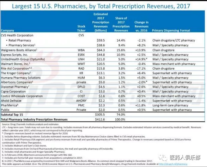 2017年美国15大药店处方药收入
