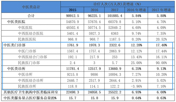 从诊疗人次来看,2017年我国中医诊疗人次首次突破10亿人次。其中,中医类门诊部和中医类诊所诊疗服务人次提升明显。这与《中医药法》中明确提到“政府举办的综合医院、妇幼保健机构和有条件的专科医院、社区卫生服务中心、乡镇卫生院,应当设置中医药科室。”带来的门诊科室增加有关: