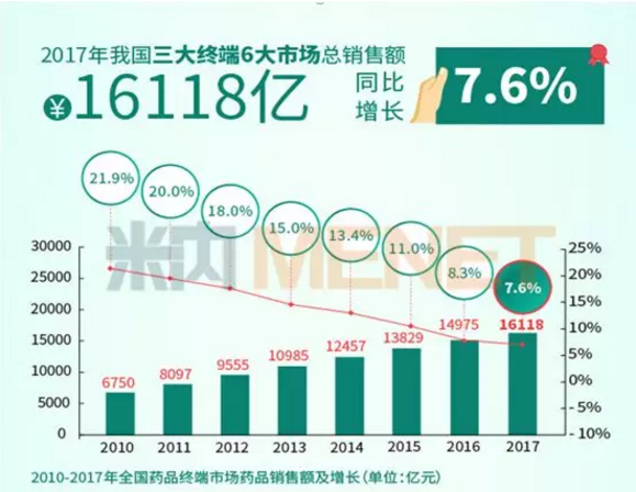 公立医疗机构终端中,2017年城市公立医院市场用药金额达到8120亿元,同比增长5.8%,占全国药品市场50.4%;县级公立医院市场用药金额达到2835亿元,同比增长10.5%,占全国药品市场的17.6%。
