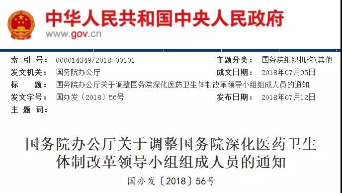 7月12日,国务院办公厅发布《关于调整国务院深化医药卫生体制改革领导小组组成人员的通知》国办发〔2018〕56号。