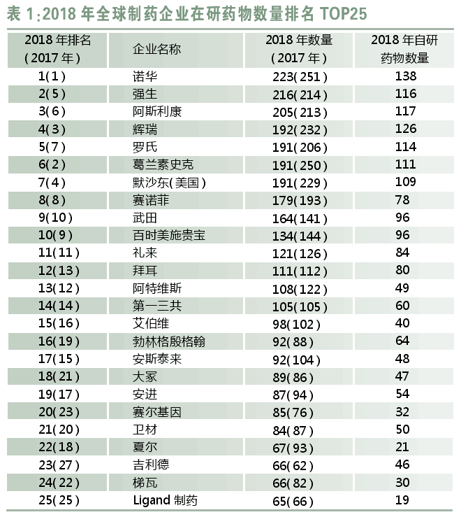从2018年数据来看,排名居前五位的制药公司分别为诺华、强生、阿斯利康、辉瑞和罗氏,其在研药物数量分别为223个、216个、205个、192个和191个。