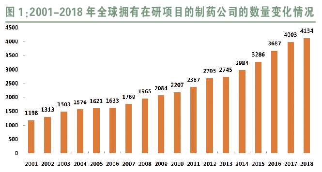 除了大型制药企业,制药研发行业同样存在着数以千计的小型制药研发公司,并拥有数量众多的在研药物项目。据统计,在过去的一年中,新成立的制药研发公司数量为670家,而2016年和2015年该数字则分别为750家和618家。全球拥有在研药物项目的制药公司数量,近年来一直呈现增长态势,数量已从2001年的1198家增长至2018年的4134家。