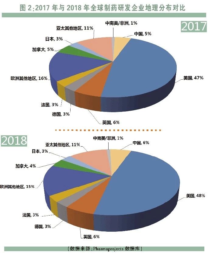从统计数据来看,美国和欧洲地区的制药企业仍是全球新药研发的主要动力来源;而亚洲地区的占比则继续保持增长势头,其占比已从2017年的19%增长至2018年的20%。