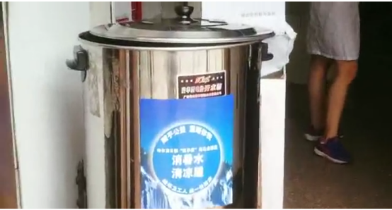 药房的工作人员几次走上街头给环卫工人、巡逻女警、市民和游客免费发绿豆水,引得南方来的旅游团的游客纷纷用自己的随身水壶排队接绿豆水。