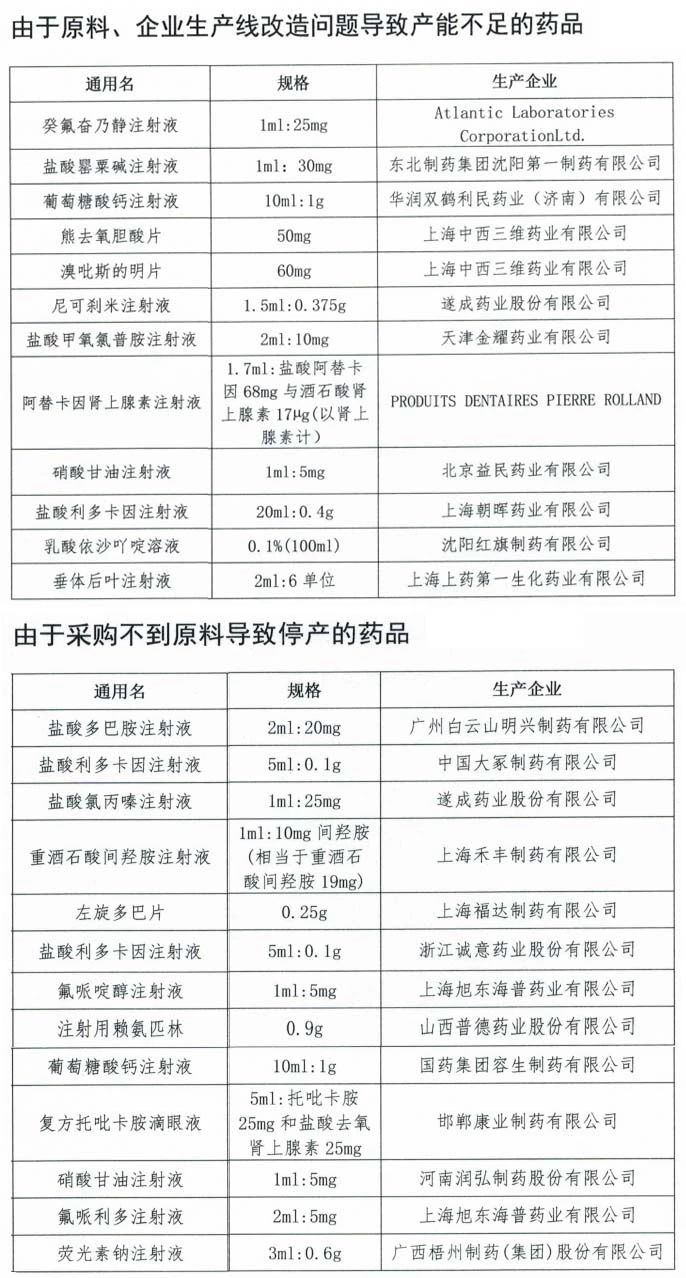 经核实调查, 有12个药品由于原料、 企业生产线改造等原因而造成产能不足; 13个药品由于采购不到原料而停产。还有17个药品,以原料药价格上涨、 中标价格低为由不能正常供应,这一类暂且不说。