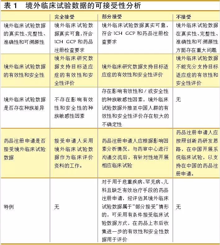 如表1所示,国家药品监督管理局认可的境外临床试验数据,主要从三方面进行考虑:一是境外临床试验数据的真实性、完整性、准确性和可溯源性,二是境外临床试验数据的有效性和安全性,三是境外临床试验数据是否存在种族差异。