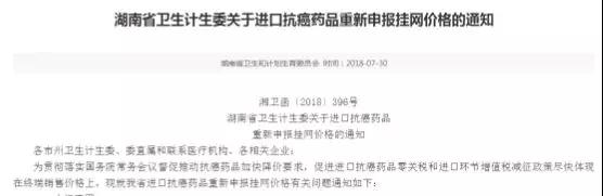 7月30日,湖南省卫计委发布两则通知:《湖南省卫生计生委关于进口抗癌药品重新申报挂网价格的通知》和《湖南省卫生计生委关于保障国家谈判药品临床使用的通知》。通知要求,在湖南省现行药品集中采购中中标的降税进口抗癌药品应重新申报挂网价格,价格下降金额不得少于降税金额;国家谈判的39种药品暂不纳入医疗机构药占比统计范围,暂实行单独核算、合理调控。