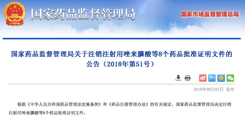 医药网8月8日讯 8月7日,国家药监局发布《关于注销注射用唑来膦酸等8个药品批准证明文件的公告(2018年第51号)》。