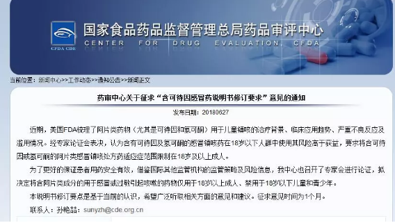 今年6月份,国家食品药品监督管理局药品审评中心(CDE)公开征求“含可待因感冒药说明书修订要求”意见,该《意见稿》指出,美国FDA梳理了阿片类药物(尤其是可待因和氢可酮)用于儿童镇咳的治疗背景、临床应用趋势、严重不良反应及滥用情况。经专家论证会表决,认为含有可待因及氢可酮的感冒镇咳药在18岁以下人群中使用其风险高于获益,要求将含可待因或氢可酮的阿片类感冒镇咳处方药适应症范围限制在18岁及以上成人。