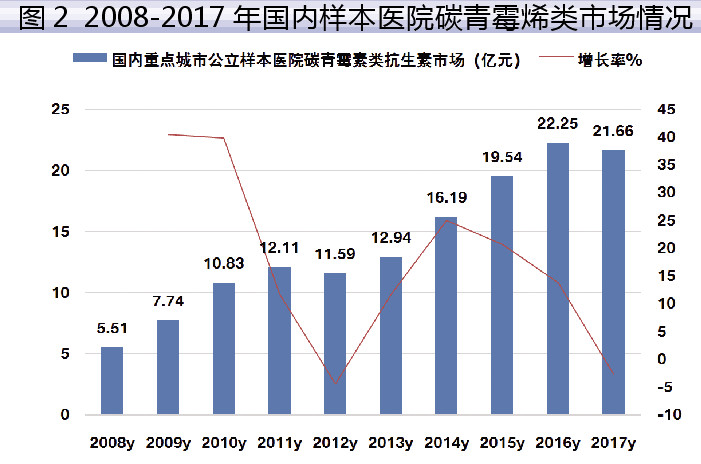 据米内网数据,2017年国内重点城市公立样本医院碳青霉烯类抗菌药物用药金额为21.66亿元,同比上一年下降了2.65%,相比抗细菌感染用药的增长率低2.14个百分点。相比上一年碳青霉烯类抗菌药物13.89%的增长率下降了16.54个百分点。