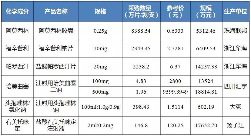 从目前网传的采购量来看,6个产品中市场规模最大的可能是四川汇宇的注射用培美曲塞二钠,两个规格抢下3.23亿元市场。其次是扬子江的盐酸右美托咪定注射液,预计将抢下1.7亿元的规模。其次是浙江华海的治疗高血压和心力衰竭药福辛普利钠片。
